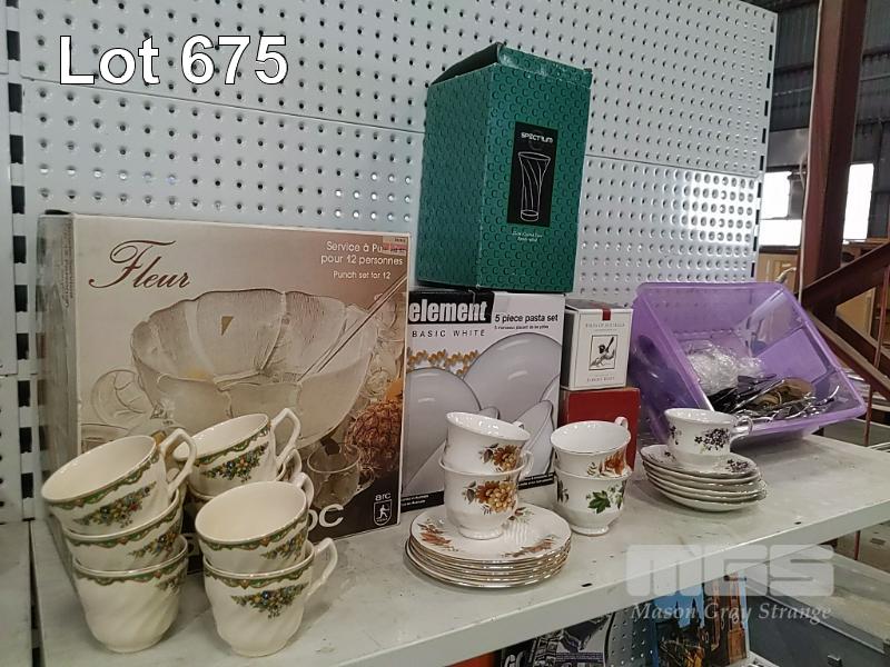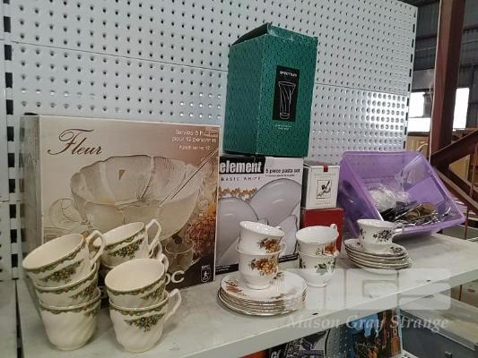 CUTLERY, CHINA TRIOS, 5 PIECE PASTA SET, BOWL, VASE, ETC, 1 x SHELF