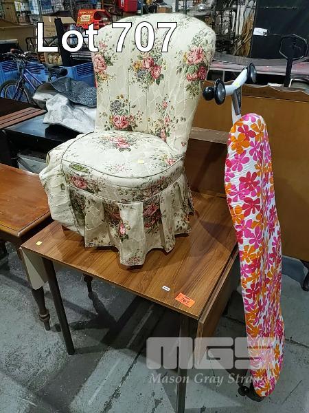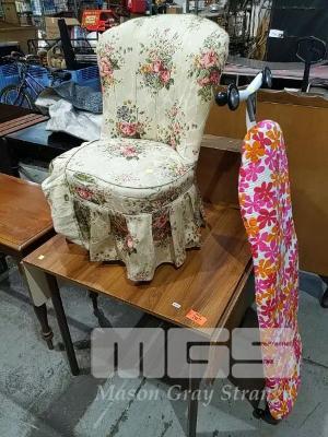 TIMBER LAMINATE DROP SIDE TABLE, IRONING BOARD & DRESSER CHAIR, FLORAL FABRIC