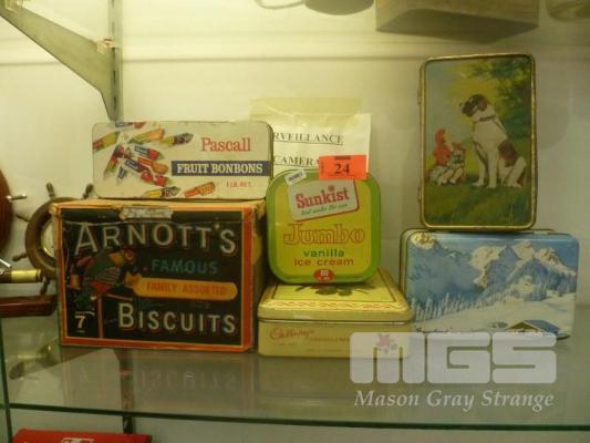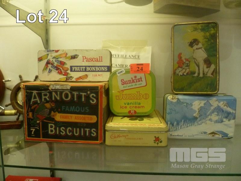 6 x VINTAGE ADVERTISING TINS, ARNOTTS, CADBURY, MACROBERTSON, PASCALL, SUNKIST, ETC