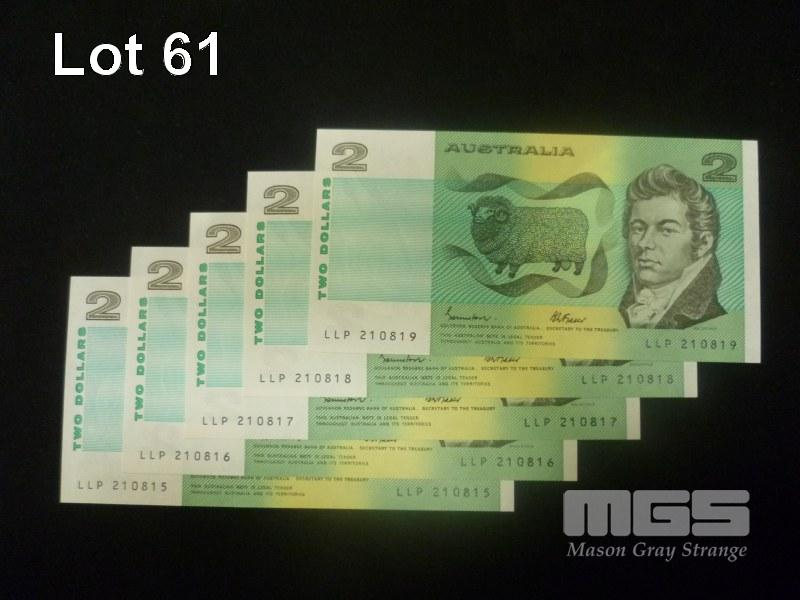 1985 5 x $2.00 NOTES CONSECUTIVE JOHNSTON FRAZER UNC