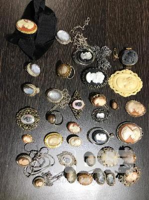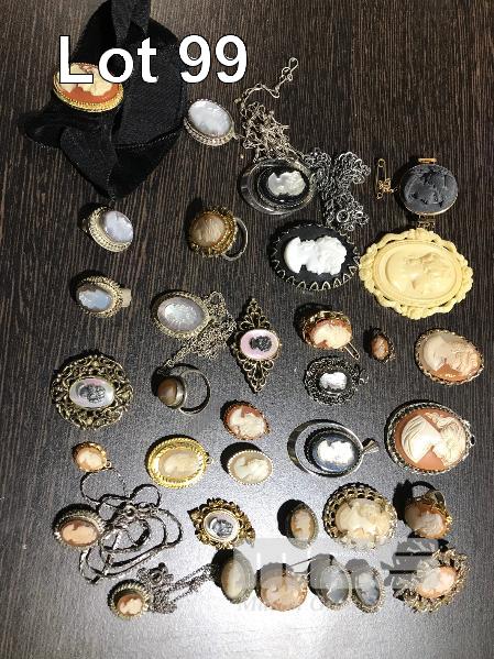 ASSORTED COSTUME CAMEO JEWELLERY INC BROOCHES, CLIP ON EARRINGS, CHAINS WITH PENDANTS, RINGS ETC