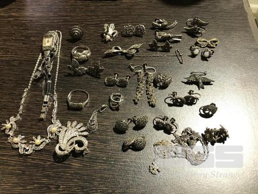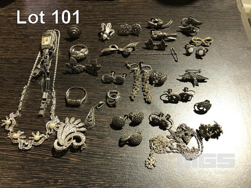 ASSORTED MARCASITE JEWELLERY INC BROOCHES, NECKLACES, PENDANTS, CLIP ON EARRINGS & BUREN LADIES WRISTWATCH MAINLY HALL MARKED SILVER, SOME STERLING