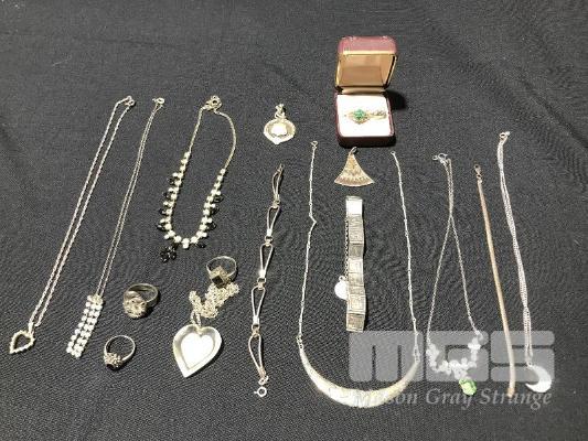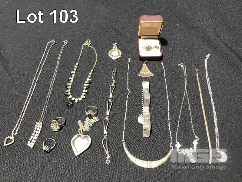 ASSORTED SILVER JEWELLERY, NECKLACES, PENDANTS & 5 X ASSORTED RINGS