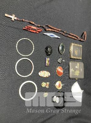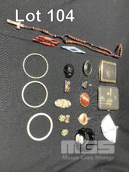 ORIENTAL STYLE MAKE-UP COMPACT, CIGARETTE CASE, PENDANT MIRROR, GLASS & COMPOSITE BROOCHES, ENAMELED PIECES,