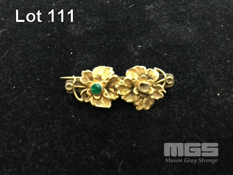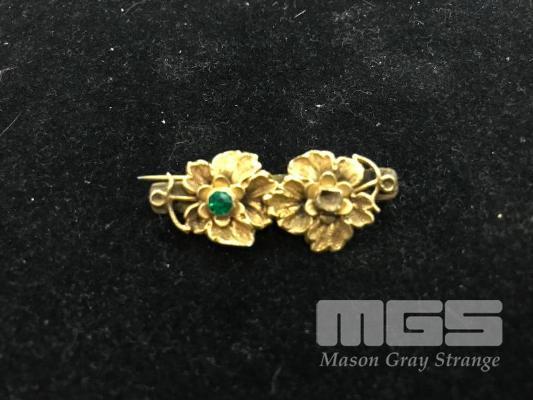 GOLD FLORAL BROOCH/PIN, VINTAGE DESIGN WITH GREEN STONE (1 X MISSING), 18CT, 3.8gms