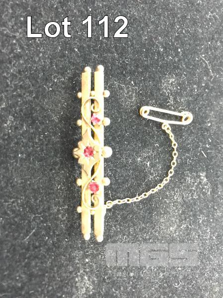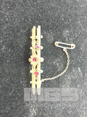 GOLD DOUBLE BAR BROOCH/PIN, VINTAGE DESIGN WITH 3 X PINK STONES, MARKED 15CT, 4.5gms