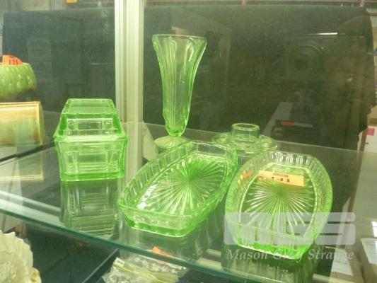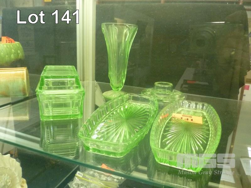 GREEN DEPRESSION GLASS BUTTER DISH, 2 x DISHES, VASE & FROG