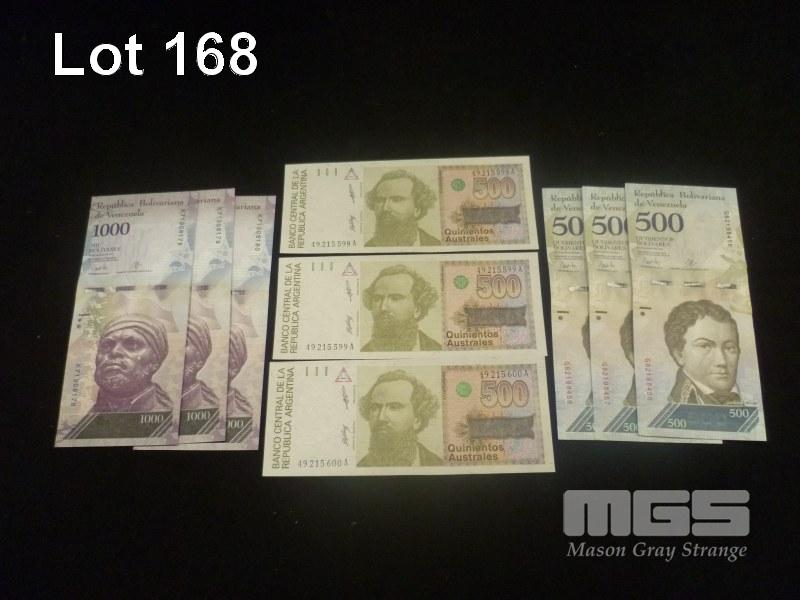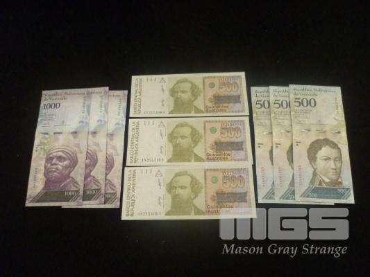 3 x ARGENTINA 1988-90 500 AUSTRALES BAN NOTE,S UNC, 3 x VENEZUELA 2017 500 BOLIVARES AN NOTES, UNC & 3 x VENEZUELA 2017 1000 BOLIVARES BANK NOTES, UNC