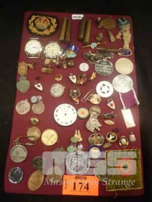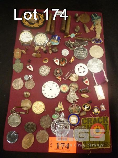 ASSORTED PINS, TOKENS, CUFF LINKS, WATCHES, SHELL CASINGS, ETC