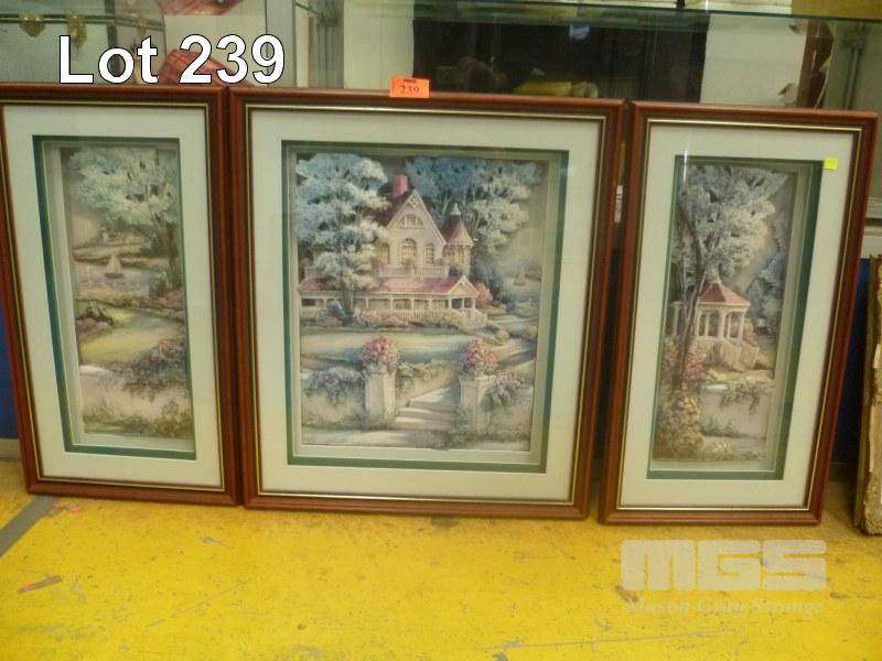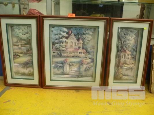 3 X FRAMED TEXTURED/LAYERED 3 D WALL HANGINGS DEPICTING HOMESTEAD, GAZEBO & LAKE SCENE