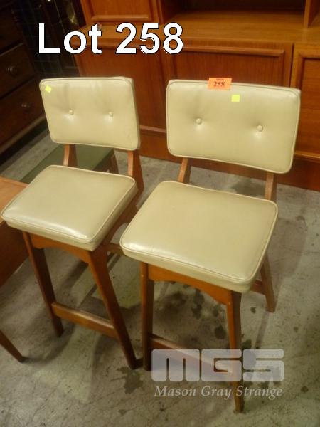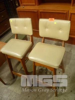 MID CENTURY BAR STOOLS, TEAK FRAMED, BEIGE VINYL UPHOLSTERY