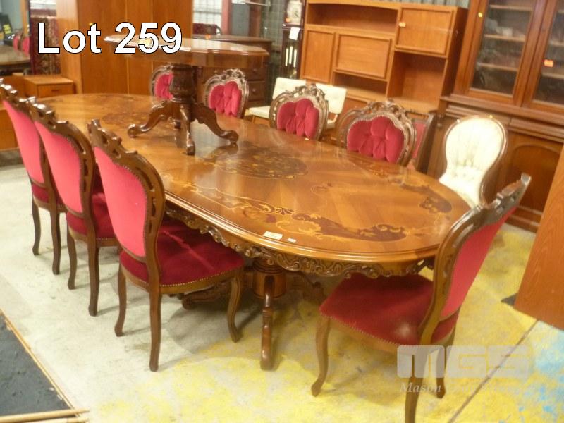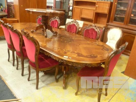 ORNATE 9 PIECE DINING SUITE INC OVAL EXTENSION TABLE, MARQUETRY & FLORAL INLAYS, DUAL PEDESTAL WITH 8 x ORNATE CARVED CHAIRS, RED VELVET UPHOLSTERED,