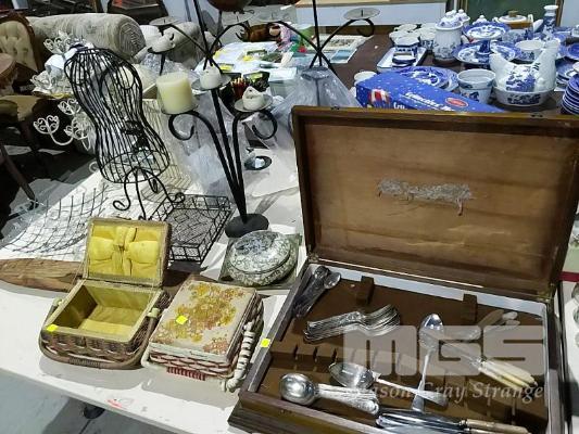GROSVENOR CUTLERY SET, CHRISTMAS HOUSE TINS, ASSORTED CANDELABRAS, ETC, 1 x TABLE