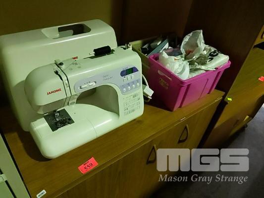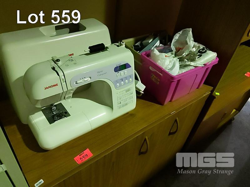 JANOME DECOR COMPUTER SEWING MACHINE, DC3050 (NO POWER CORD OR FOOT PEDAL) & HORN SEWING CABINET & ACCESSORIES