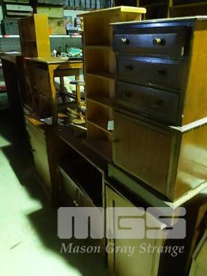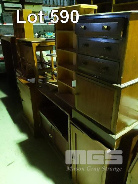 SMALL BOOKCASE WITH SET ENCYCLOPEDIAS, WALL DISPLAY SHELF, NEST 2 TABLES, 2 x SINGLE DOOR CABINETS, CD RACK, STAND & 2 DOOR CABINET