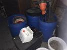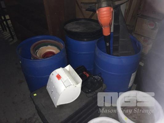3 x PLASTIC BARRELS, PLASTIC GARDEN POTS, BLACK & DECKER CORDLESS LINE TRIMMER, BATTERIES & CHARGER, CHICKEN WIRE, WORM FARM, ETC