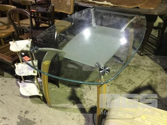 MODERN RECTANGULAR DINING TABLE, GLASS TOP, METAL FRAME, TIMBER INLAYS