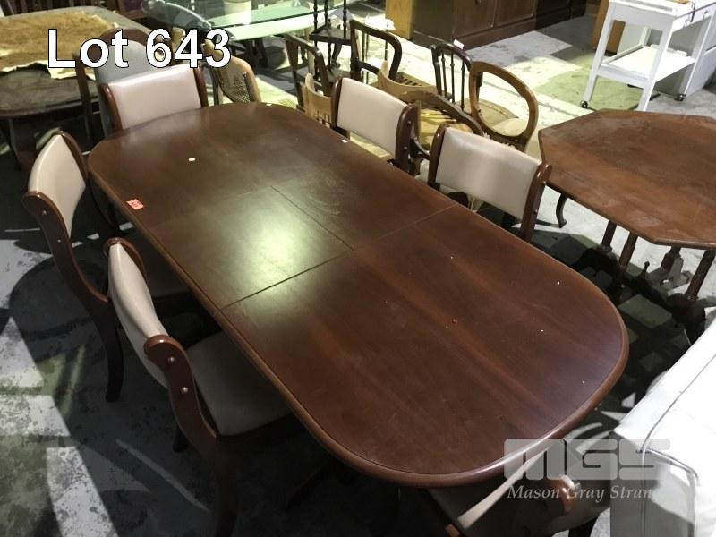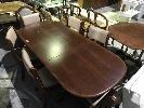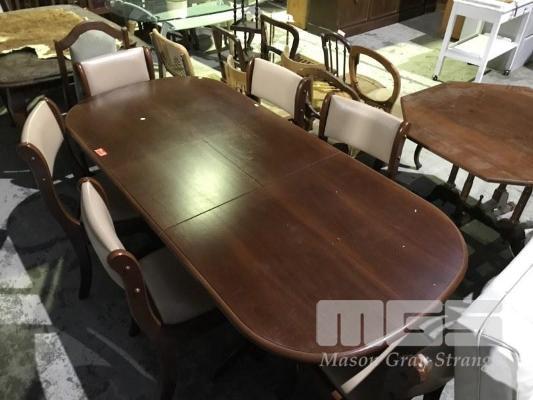 MAHOGANY 7 PIECE DINING SUITE INC OVAL EXTENSION TABLE, STRETCHER BASE & 6 x BEIGE VINYL CHAIRS