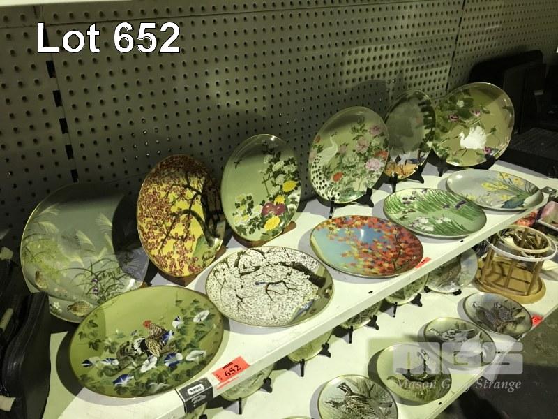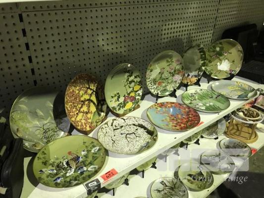13 x ASSORTED COLLECTABLE PLATES, BIRDS, TREES & FLOWERS, 1 x SHELF