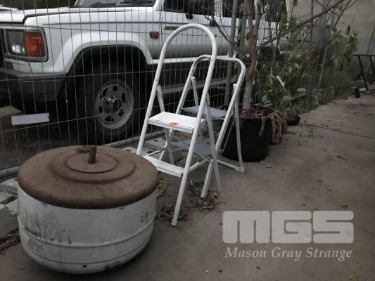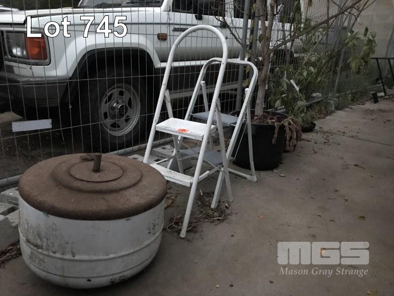 2 x PLANTS, 2 x STEP LADDERS & ENAMEL PLANTER BOX