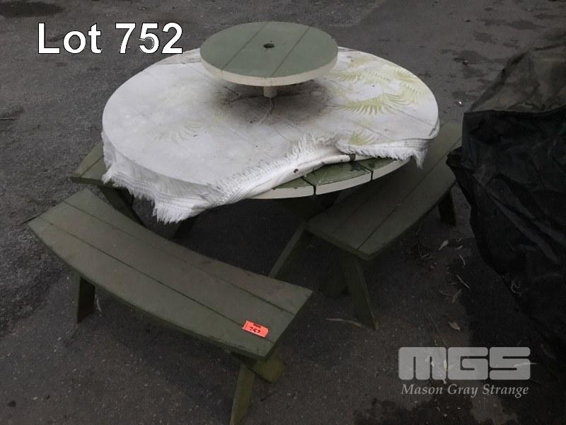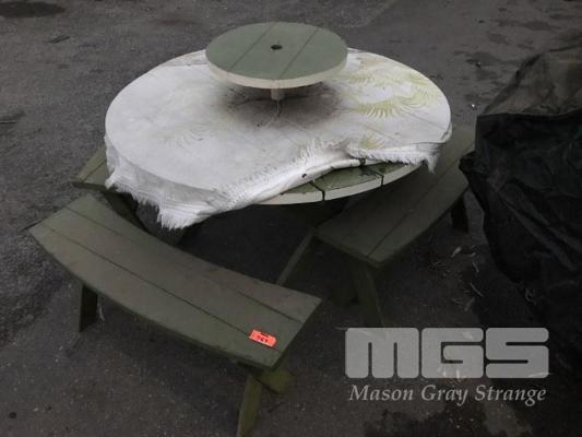 SLAT TIMBER OUTDOOR SETTING, CIRCULAR TABLE & 4 x BENCH SEATS