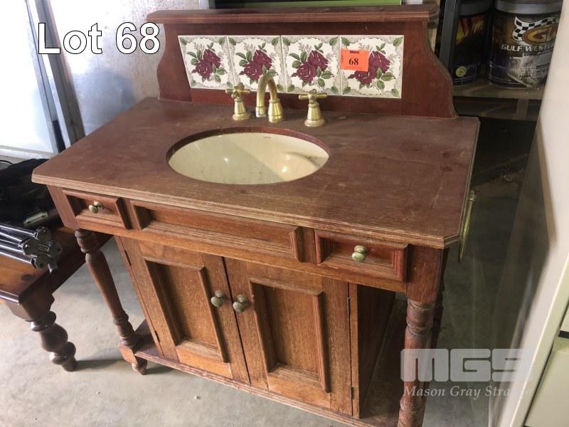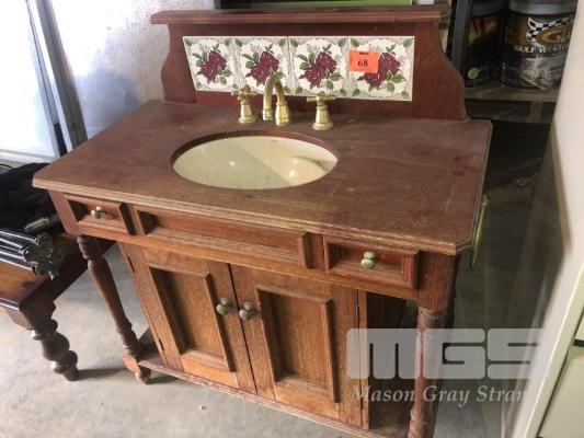 TIMBER BATHROOM SINK, FLOWER TILES, 2 DOOR, 1010mm (L), 830mm (H), 500mm (D) BRASS TAP WARE
