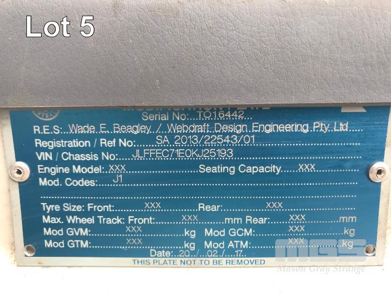 2016 MITSUBISHI FUSO 815 CANTER 4x2 REFRIGERATED PANTEC REG: SB 41 MQ VIN: JLFFEC71EOKJ25193 ENG: 4PL0C43748 ODO: 18,174ksm SHOWING GVM: 7,500kg GCM: 11,000kg 4 CYLINDER, 5 SPEED MANUAL TRANSMISSION, DIESEL, SPRING SUSPENSION, 2 DOORS, 3 SEAT, AIR CON, CD PLAYER, BARN DOORS, DAY CAB, BODY INTERNAL SIZE: 410cm (L) HEIGHT: 200cm WIDTH: 205cm REVERSE CAMERA BLUETOOTH SAT NAV REAR STEP ATR POLAR FREEZ PF-250E FRIDGE UNIT WITH IN CAB DIGITAL CONTROL MEAT HANG RAILS, EXTERNAL 240V PLUG KEY #11 (WITH PAPERS, WITH OWNER'S MANUAL, WITH SERVICE BOOKS) CONDITION: - IN DOOR LIGHT COVER MISSING