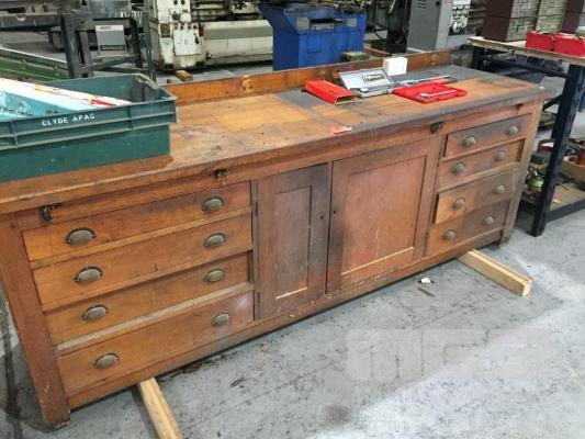 TIMBER WORK BENCH, 230 x 63cm, 8 x DRAWER/2 x DOOR