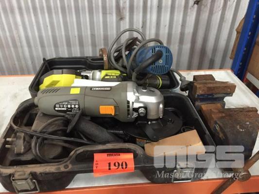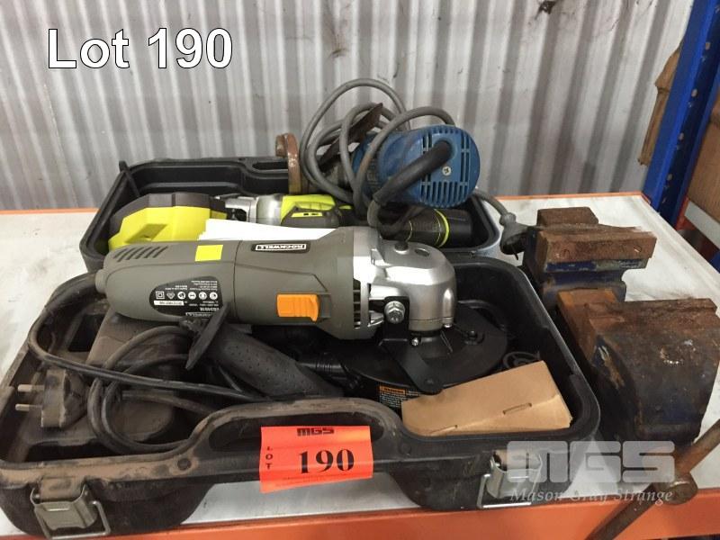 ANGLE GRINDER, CORDLESS PRUNING SAW & 4" VICE