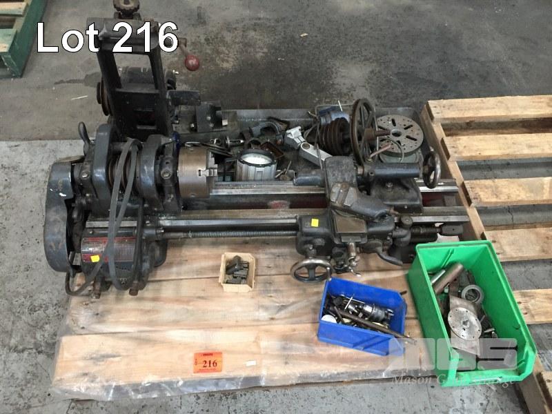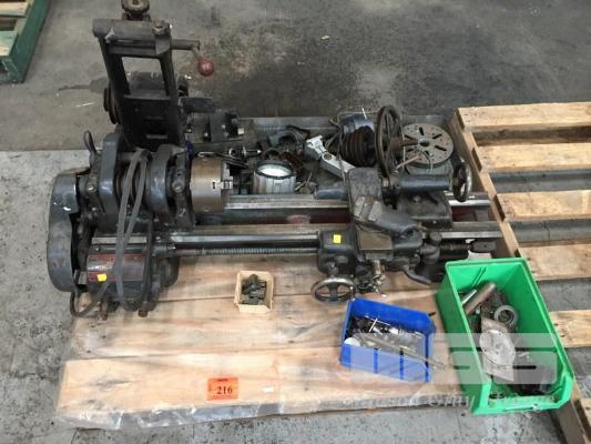 9" WORKSHOP PRECISION LATHE, HERCUS MOD: V.B A S/NO: 1455 5" 3 JAW CHUCK TAIL STOCK EXPOSED OVERHEAD BELT DRIVE, 240V WITH CHANGE GEARS 150mm 4 JAW CHUCK 2 POINT STEADY 195mm FACE PLATE 2 x DRIVE PLATES 5FT ASST DRILL CHUCKS, JAWS, ETC (DAMAGED)