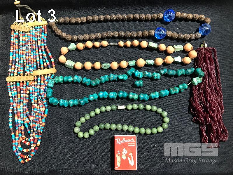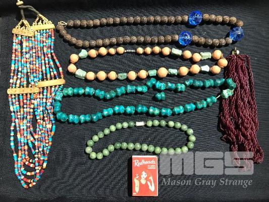 5 X ASSORTED AFRICAN STYLE BEADED NECKLACES, GREEN STONE, TERRACOTTA, PLANT SEED ETC & BEADED PENDANT THING