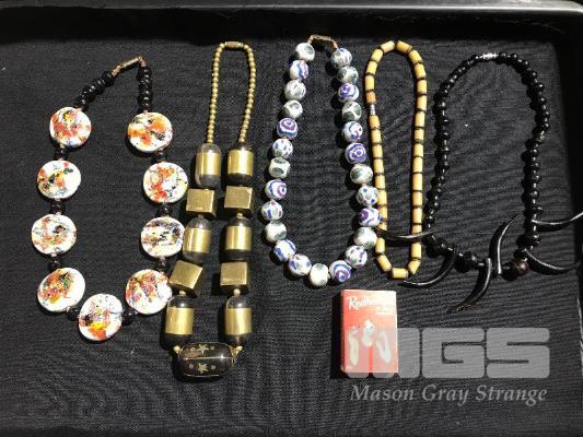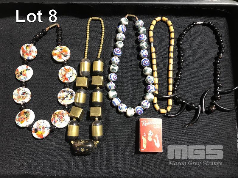 5 X NECKLACES, LARGE CHUNKY BRASS CUBE & BEADED, ART GLASS DISC, ART GLASS BEADED, BONE LOOK & EBONY STYLE NOTE- MATCHBOX FOR SIZE REFERENCE
