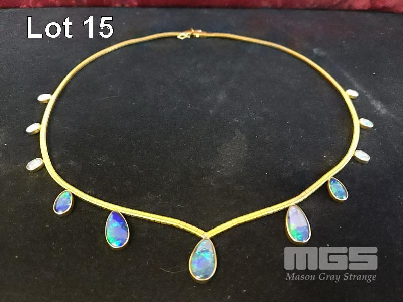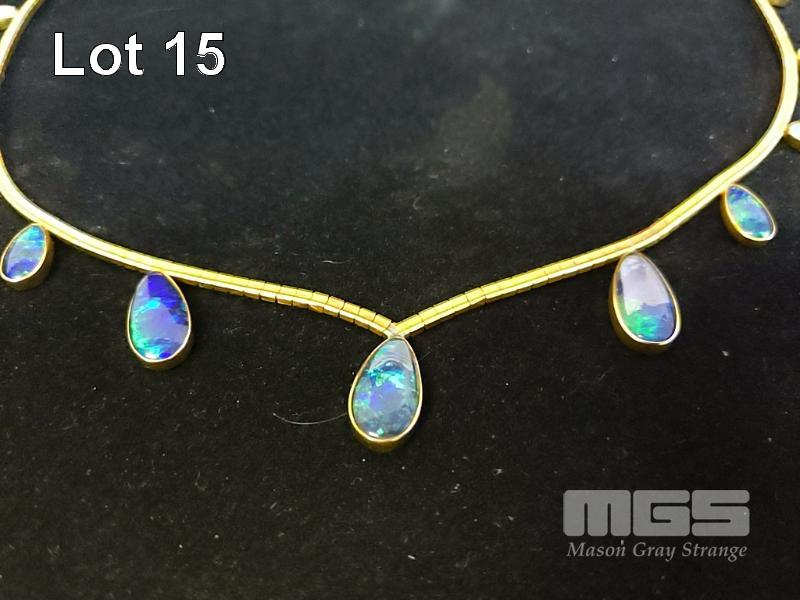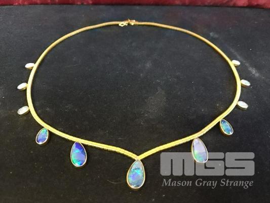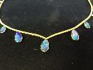 GOLD NECKLACE, V SHAPED DESIGN WITH 11 X GRADUATING OPAL TEARDROP SETTINGS, MARKED 18K 28.5 gms