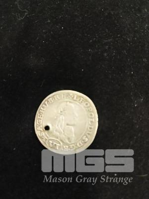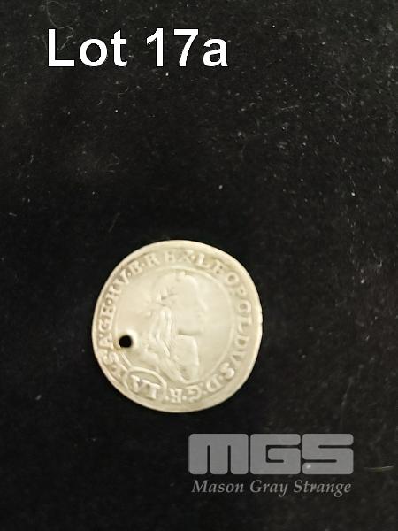 PIERCED 1673 HUNGARIAN COIN, LETTERING "LEOPOLDVS.D.G.R.(VI)I.S.A.G.HV.B.REX." AND "PATRONA..HV.NGARIAE 1673".