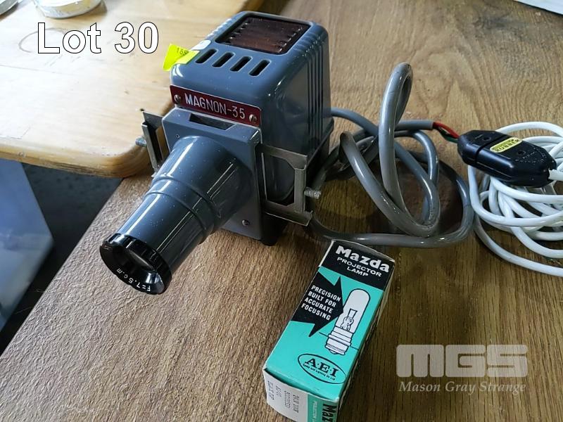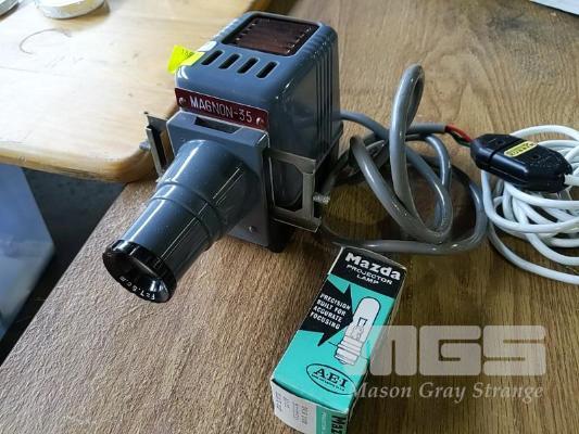 VINTAGE "MAGNON-35" SLIDE PROJECTOR WITH SPARE LAMP IN ORIGINAL BOX.