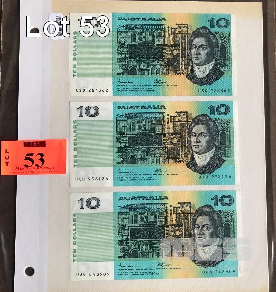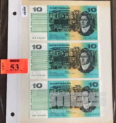 3 X AUSTRALIA, $10, PAPER, BANKNOTES, INC; USD 284362, UXU 938126, UUQ 848509
