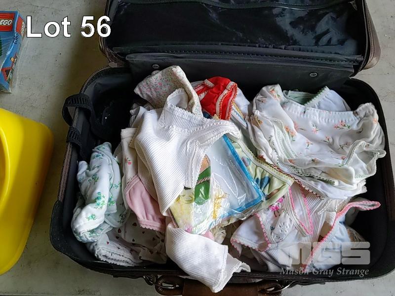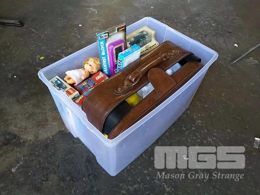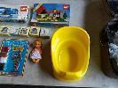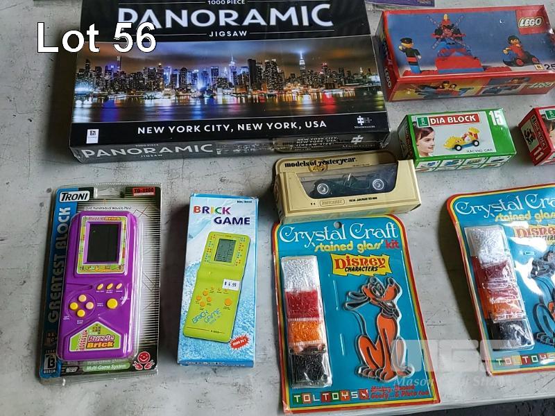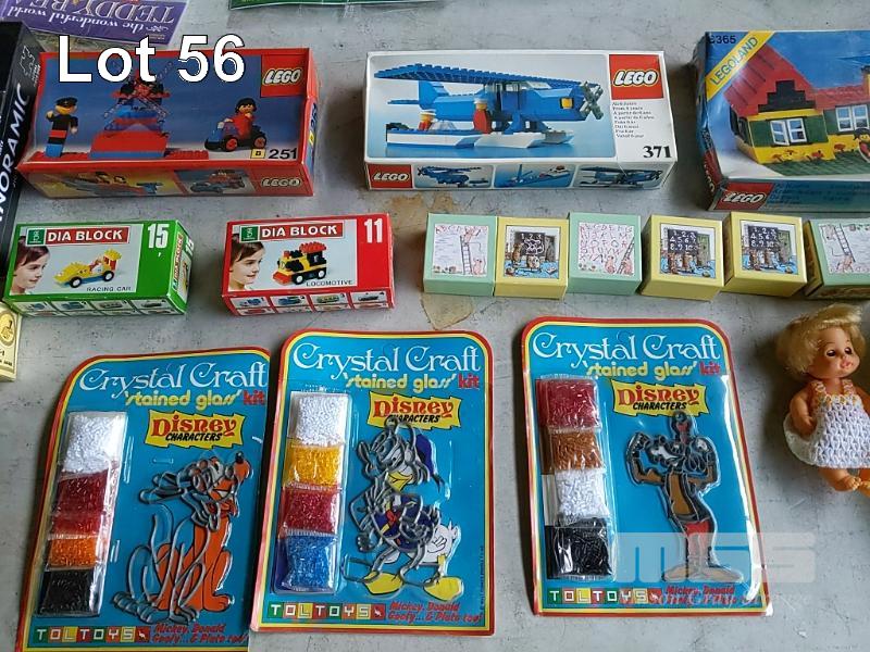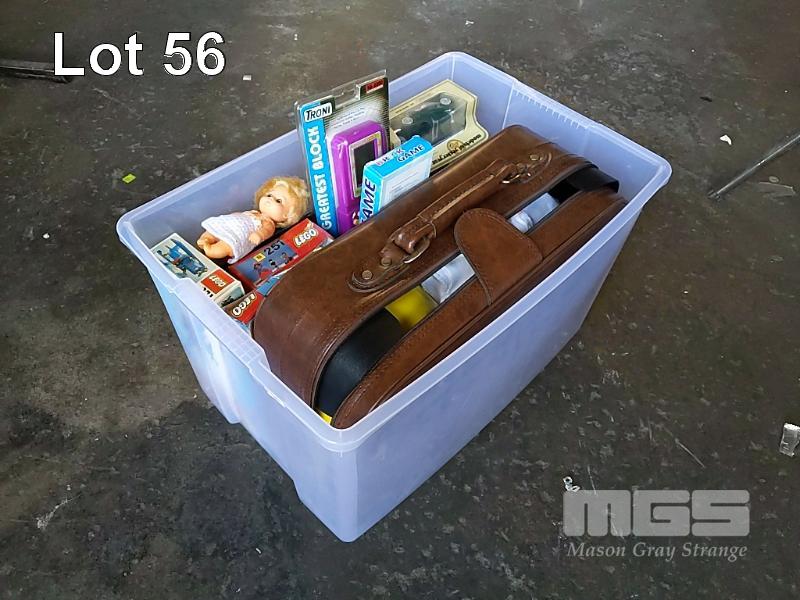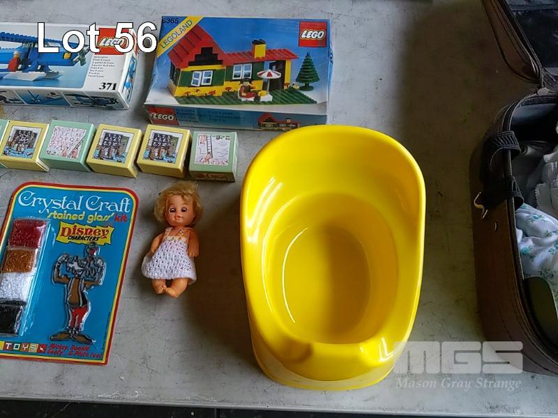 CARRY CASE OF OLD TOYS AND SOME INFANT CLOTHING. INCLUDES TOLTOYS "DISNEY CRYSTAL CRAFT", LEGO, EARLY DIGITAL GAMES, PUZZLE, POTTY, HAND PAINTED PORCELAIN DOLL AND MORE (1 x TUB).