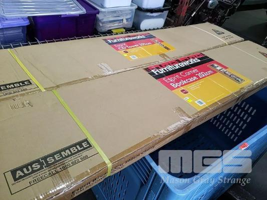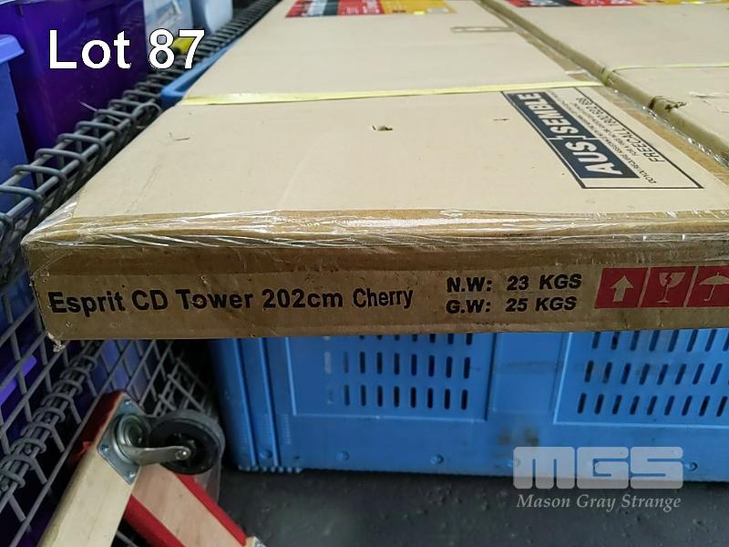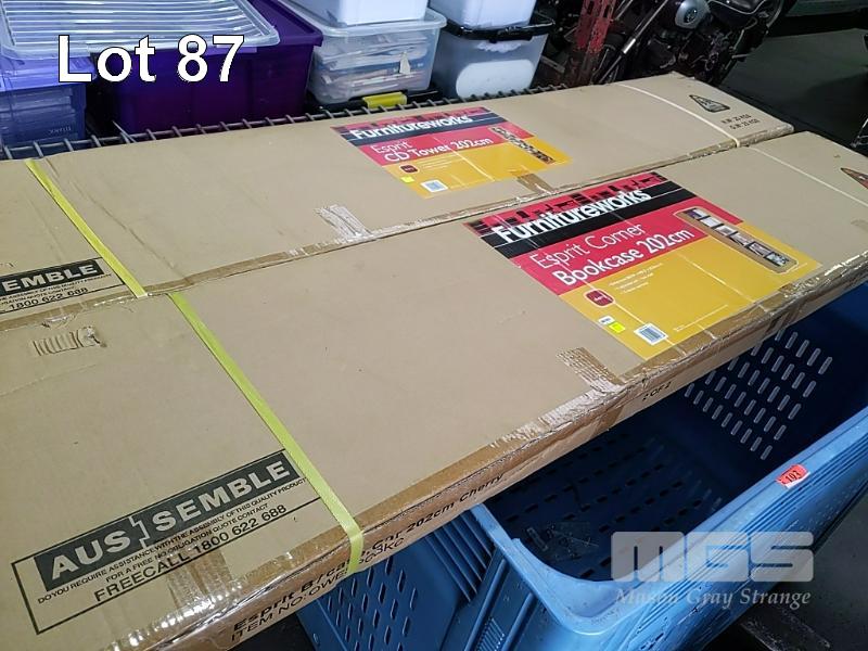 "FURNITUREWORKS" FLAT PACK CORNER BOOKCASE AND CD TOWER. BOTH 202cm H. IN UNOPENED ORIGINAL PACKAGING.