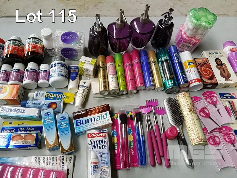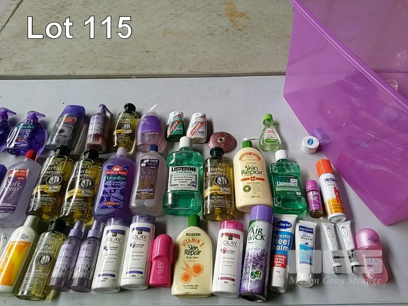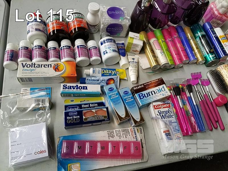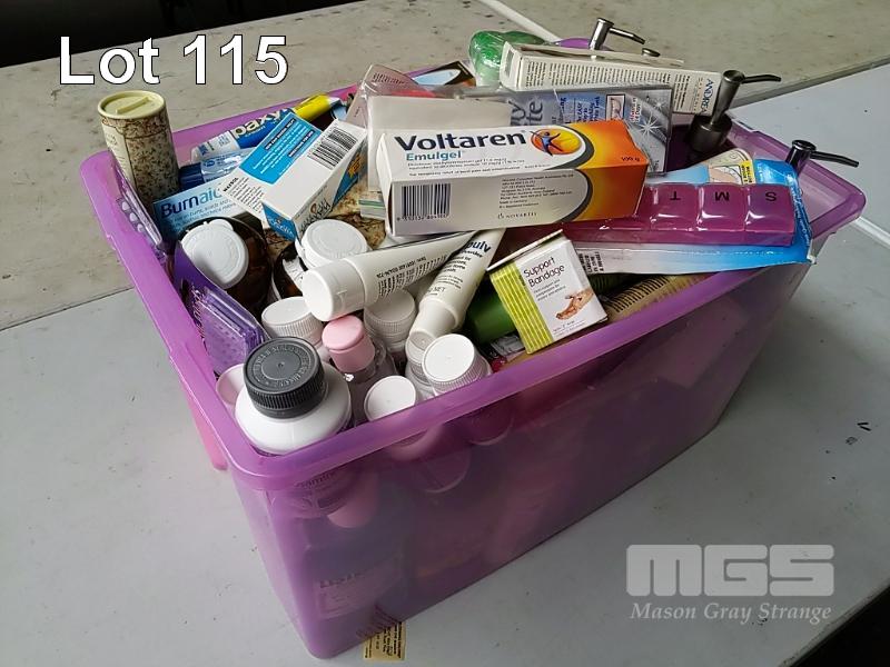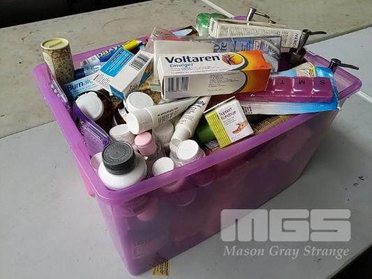 CONTENTS OF TYPICAL BATHROOM CABINETS. VITAMIN SUPPLEMENTS, MEDICATED CREAMS, ANTISEPTICS, SOAP DISPENSERS, DEODORANTS, BODY WASH & SOAPS, SHAMPOO & CONDITIONER, LIQUID HAND WASH, MOUTHWASH, TWEEZERS AND RAZORS, AIR FRESHENER, TOOTHPASTE AND MUCH MORE (1 x TUB).