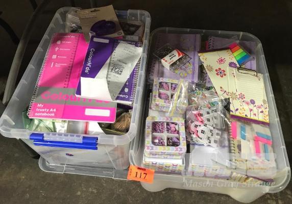 2 X TUBS OF ASSORTED STATIONERY & OFFICE SUPPLIES, NOTE PADS EXERCISE BOOKS, PENS & MARKERS, OFFICE FASTENER SETS ETC
