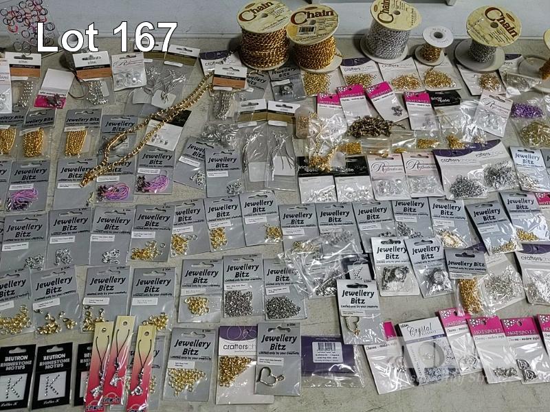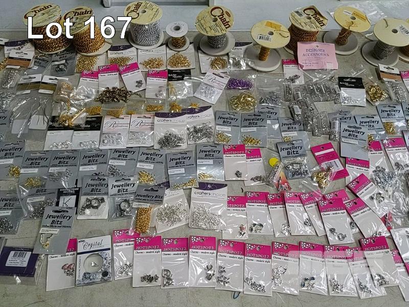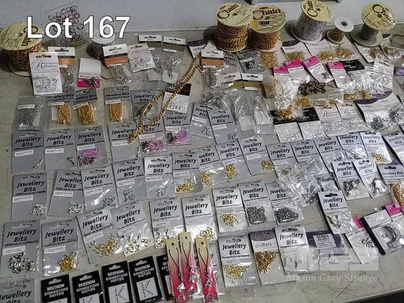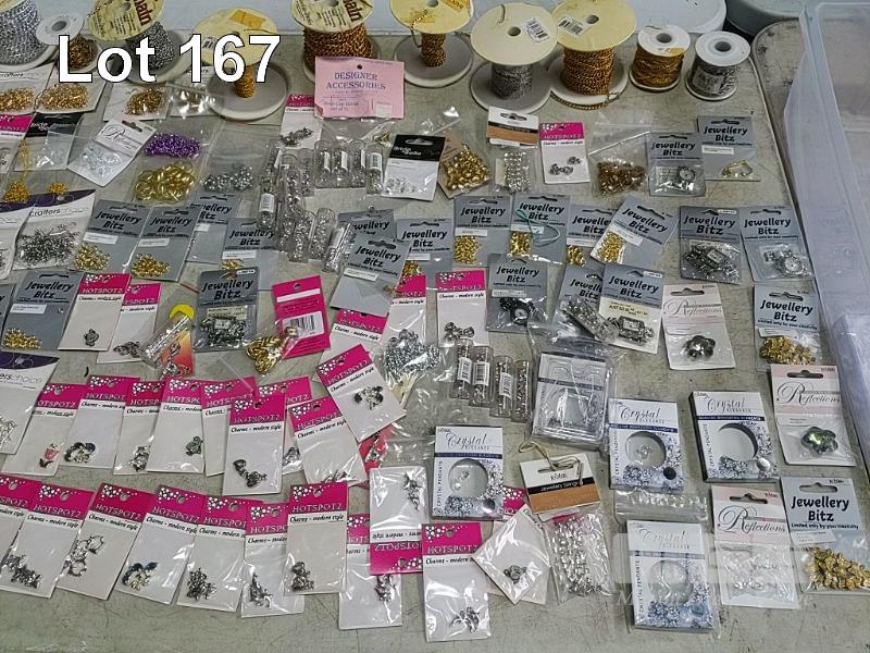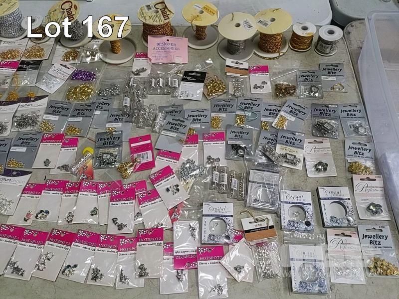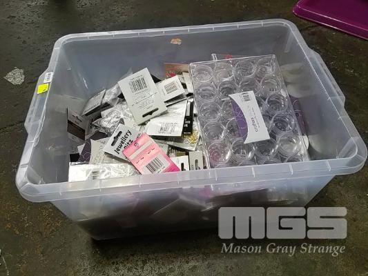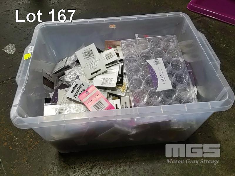 QUANTITY OF JEWELRY CRAFTING COMPONENTS INCLUDING CHAIN, CHARMS, BEADS, CLOCK FACES, CRYSTAL PENDANTS, GLASS FLOWERS, DIAMANTES, COMPONENT STORAGE BOX AND MUCH MORE. ESTIMATED 200 ITEMS PLUS (1 x TUB).
