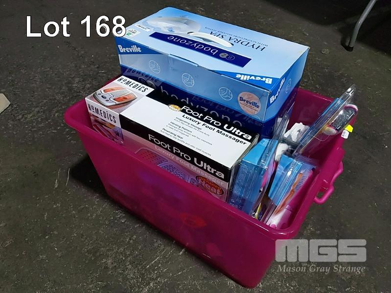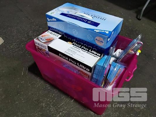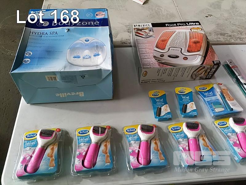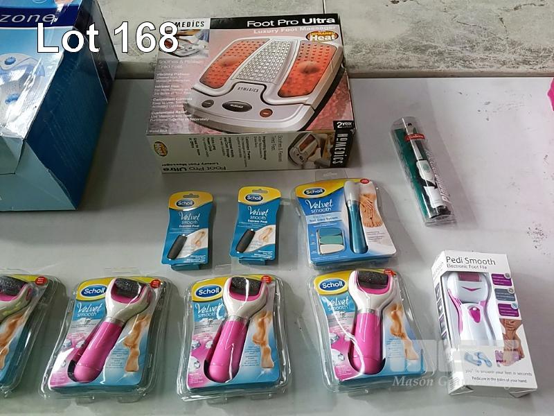 ASSORTED FOOTCARE APPLIANCES. BREVILLE BODYZONE "HYDRA SPA" FOOT MASSAGER, HOMEDICS "FOOTPRO ULTRA LUXURY" FOOT MASSAGER, 5 x SCHOLL "VELVET SMOOTH" ELECTRONIC FOOT FILE AND 2 x REPLACEMENT ROLLER HEAD PACKS, PEDI SMOOTH ELECTRONIC FOOT FILE, SCHOLL "ELECTRONIC NAIL CARE SYSTEM" AND SUNBEAM ELECTRIC TOOTHBRUSH THROWN IN FOR GOOD MEASURE. ALL NEW UNOPENED IN ORIGINAL PACKAGING (1 x TUB)