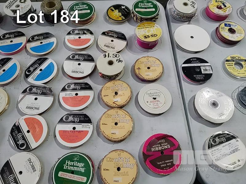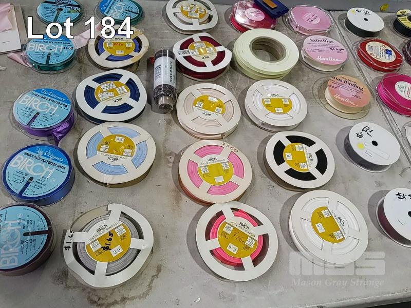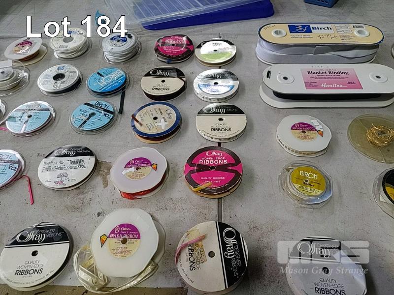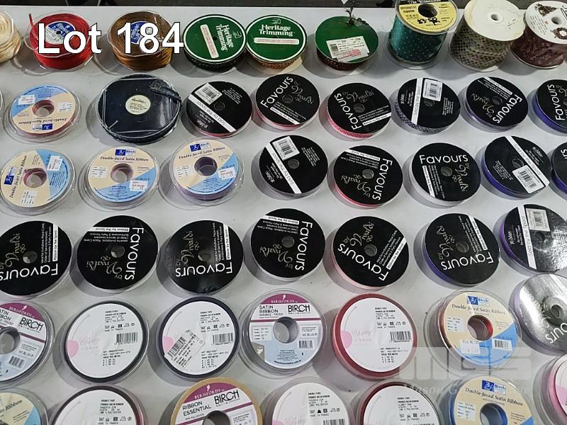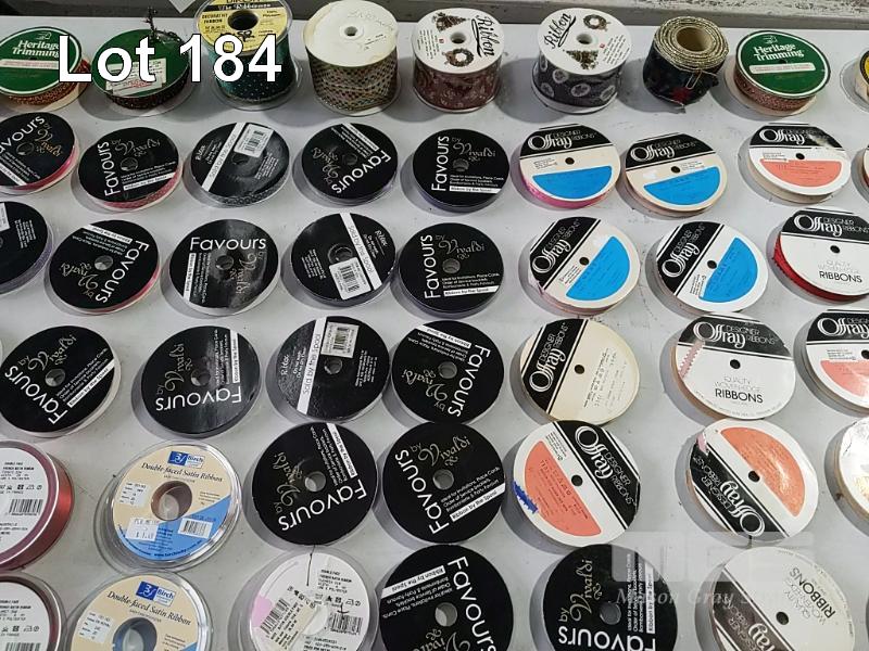 QUANTITY OF ASSORTED SPOOLED CRAFT & HOBBY RIBBON, BRAID, TRIMMING, BIAS BINDING TAPE, BLANKET BINDING TAPE, BRAIDED ELASTIC, KNITTED ELASTIC ETC. HUGE VARIETY ESTIMATED 250 ITEMS. ALSO 3 x SIMCO RIBBON STANDS. (1 x TUB + STANDS).