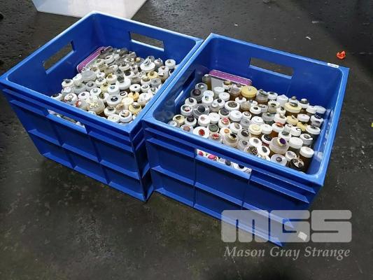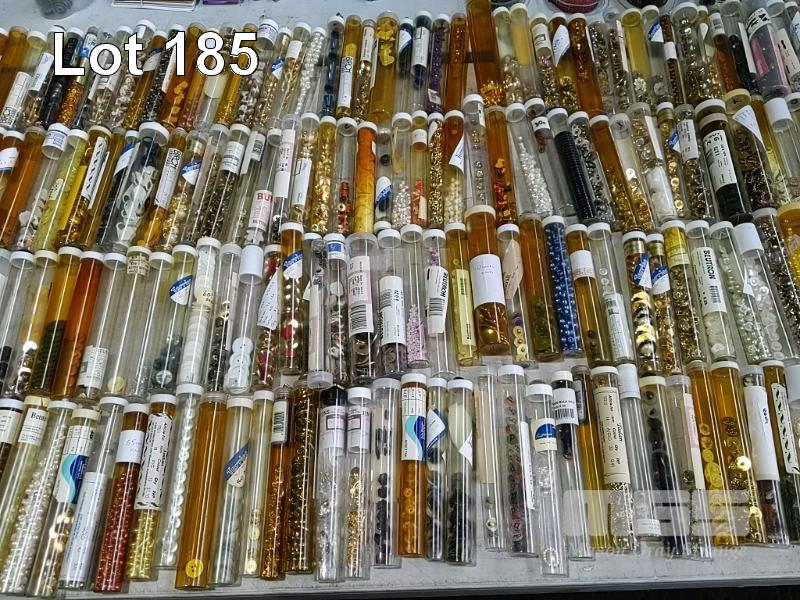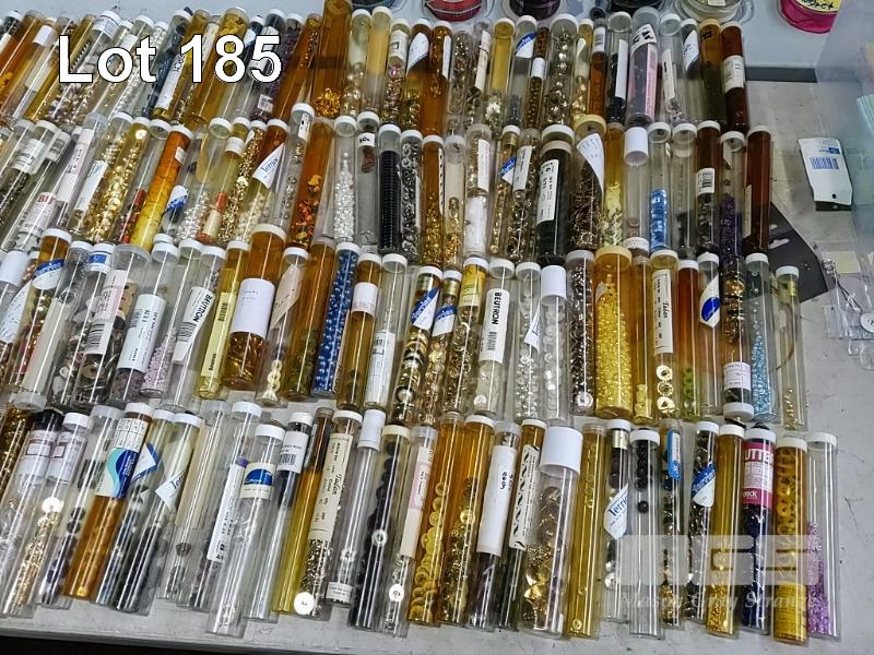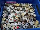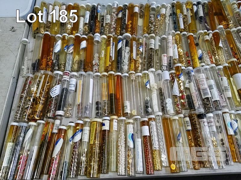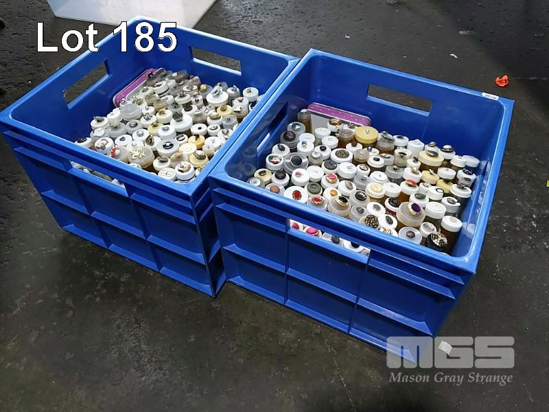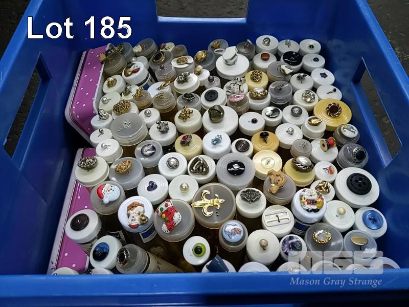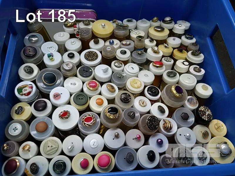 QUANTITY OF ASSORTED LOOSE BUTTONS IN BUTTON TUBES. HUGES VARIETY FLAT BUTTONS, SHANK BUTTONS, STUD BUTTONS, DECORATIVE BUTTONS AND MORE. ALL TYPES PLASTIC, METALLIC, GLASS, PEARL, BELLS & BAUBLES, NOVELTY BUTTONS AND MORE. ESTIMATED 200 BUTTON TUBES CONTAINING MANY HUNDREDS OF BUTTONS (2 x MILK CRATES - CRATES NOT INCLUDED)