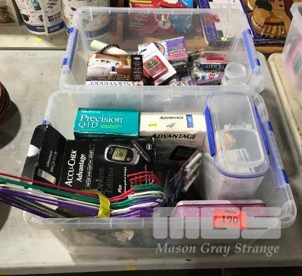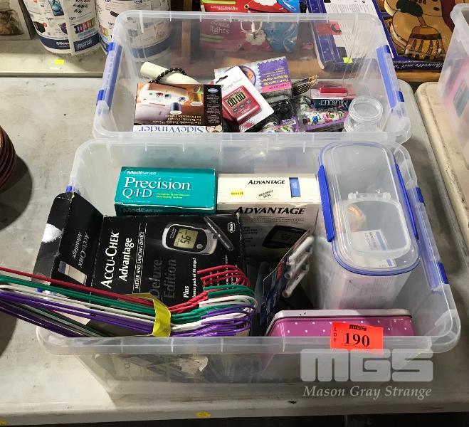 2 X PLASTIC TUBS CONTAINING BLOOD GLUCOSE MONITORS, DIGITAL TIMERS, SIDEWINDER BOBBIN WINDER & ASSORTED HOME WARES ETC