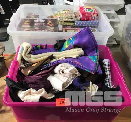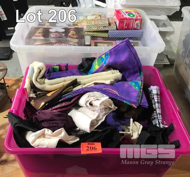 2 X PLASTIC TUBS CONTAINING FABRIC REMNANTS & SEWING SUPPLIES & HOME WARES ETC