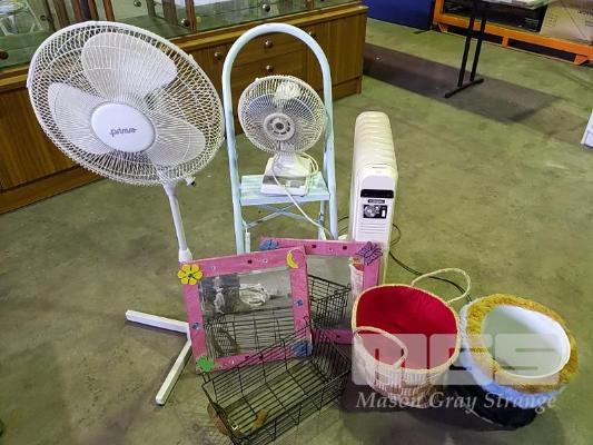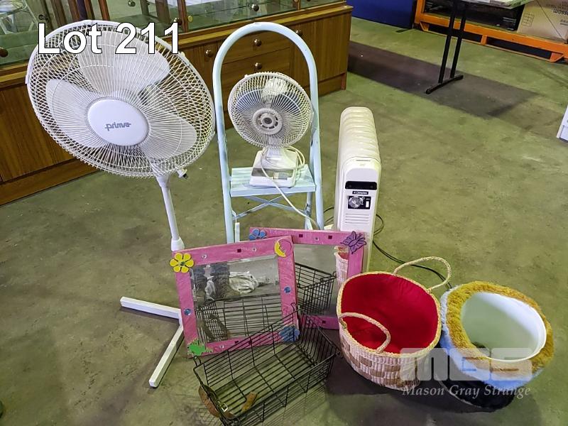 DIMPLEX ELECTRIC OIL HEATER, PEDESTAL FAN, BENCH FAN, 2 x DECORATIVE WALL MIRRORS, WOVEN REED HAMPER, PAPER BIN WITH FLUFFY COVER ETC.