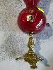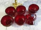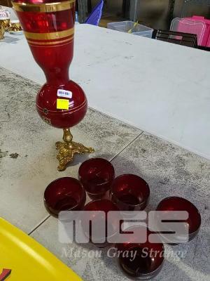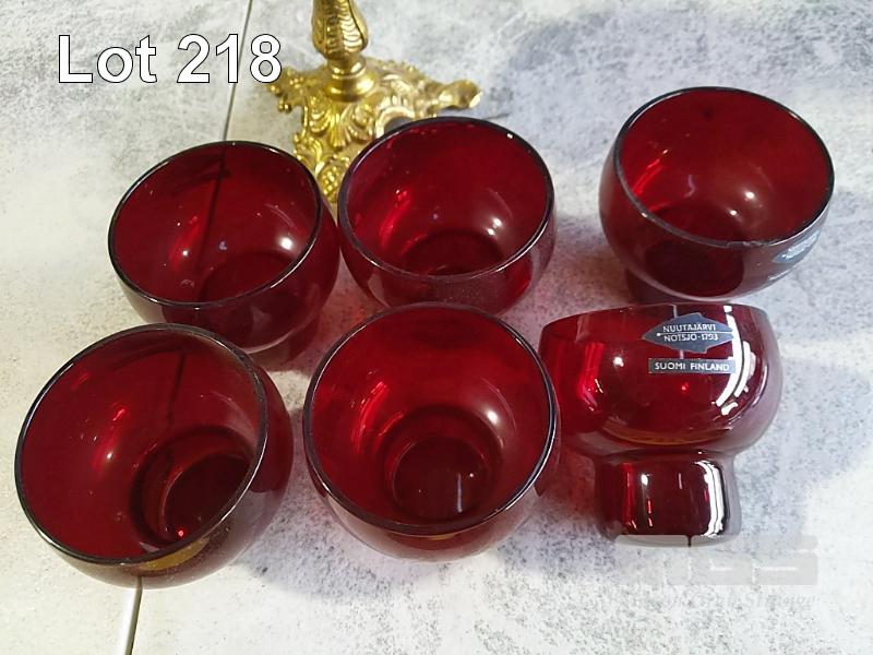 6 x VINTAGE RUBY-WARE APERITIF CUPS LABELLED " SUOMI FINLAND" AND VINTAGE GLASS JUG ON METALLIC BASE LABELLED "ARNO GENUINE HANDMADE ITALY"