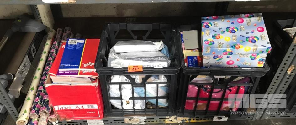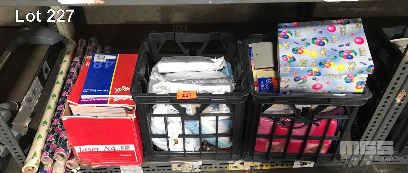 2 X PLASTIC CRATES & CONTAINING SEWING & CRAFTING SUPPLIES, ASSORTED HOME WARES, GIFT WRAP ROLLS ETC