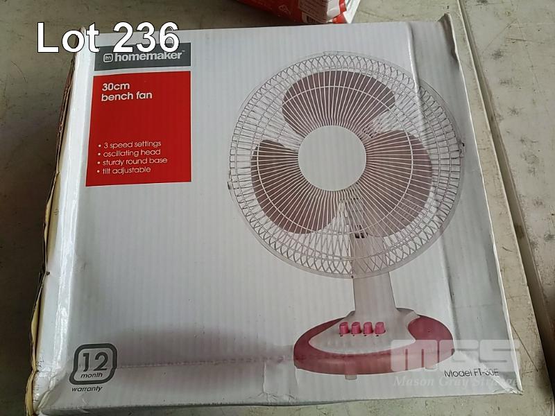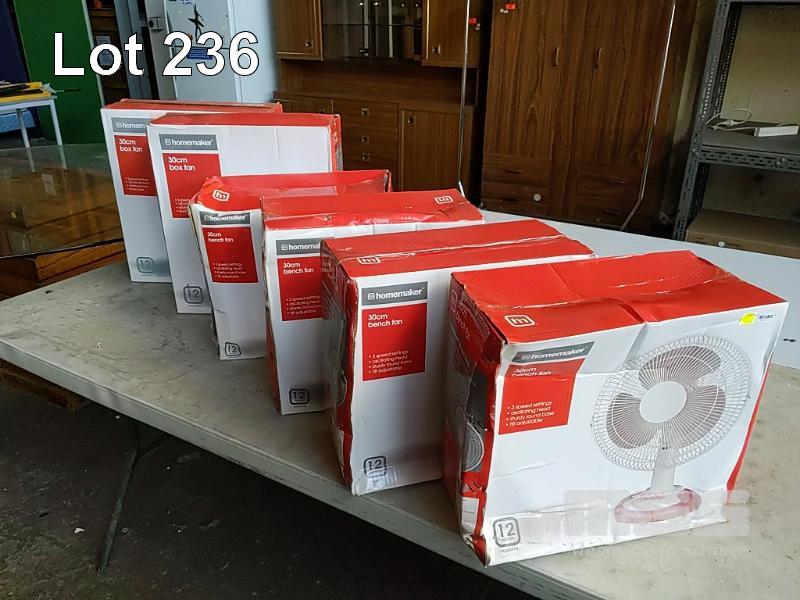 2 x HOMEMAKER 30CM BOX FANS (BF-30). 4 x HOMEMAKER 30CM BENCH FAN (FT-30E). ALL NEW IN BOX.